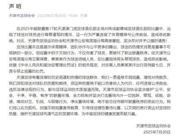 天津足协通报事件背后 足球场边界感与尊重的集体考卷九游娱乐官网 在越来越多家长陪伴孩子走进绿茵场的今天,一则“天津足协:姜某某涉嫌辱骂球员 被警方拘留7天”的通报,将原本该属于激情与拼搏的足球赛场,推