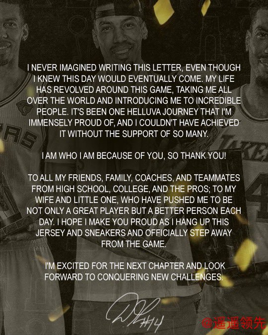 丹尼-格林在社交媒体发布亲笔信正式宣告退役,在信中,他感谢了篮球,感谢了球迷,感谢了朋友、家人和所有的教练队友,并特别感谢了妻子和孩子的支持。