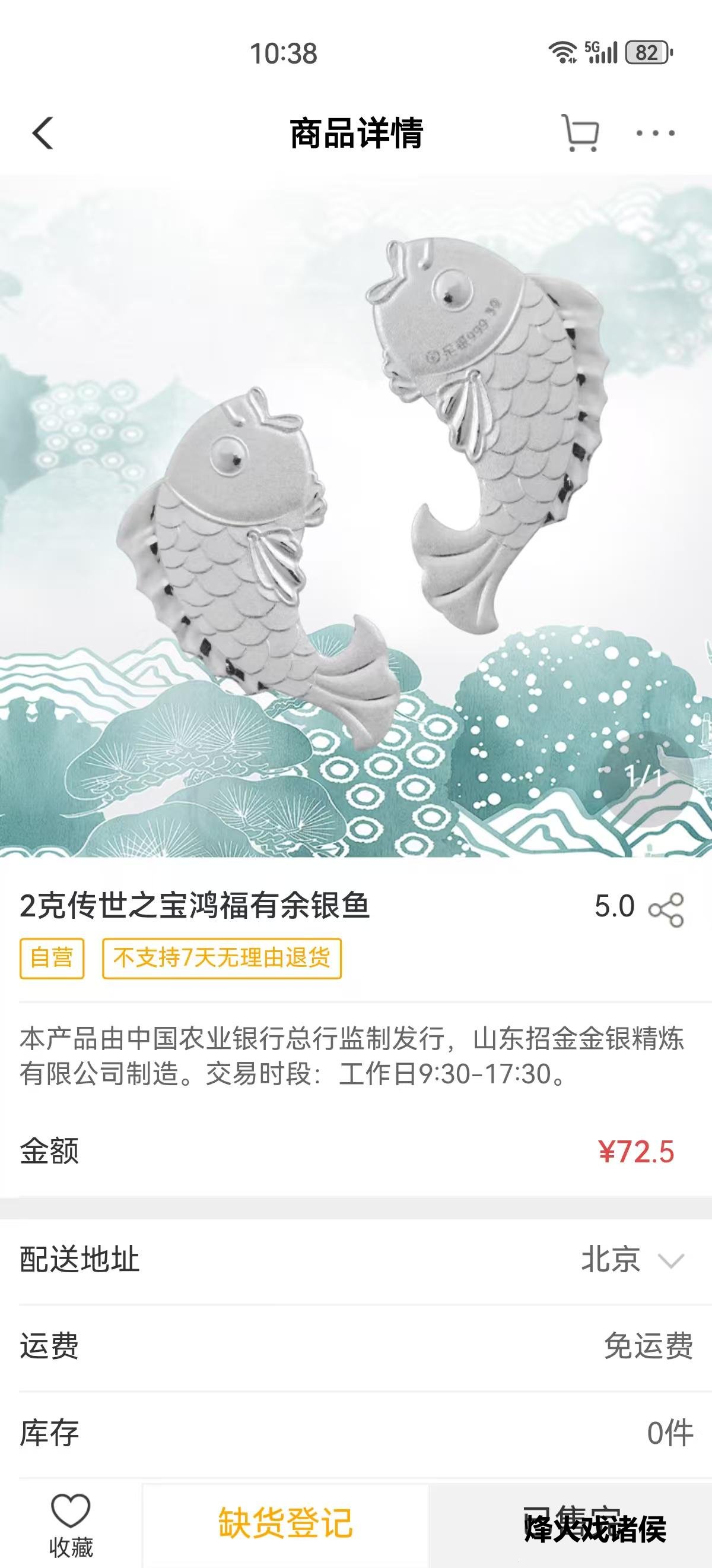 于此同时,农业银行手机银行APP显示,截止今日上午,该行已有两款银质品“2克传世之宝鸿福有余银鱼”和“15克传世之宝生肖马银吊牌”出现缺货,官方显示,目前上述两款产品“已售完”,但可以进行缺货登记。