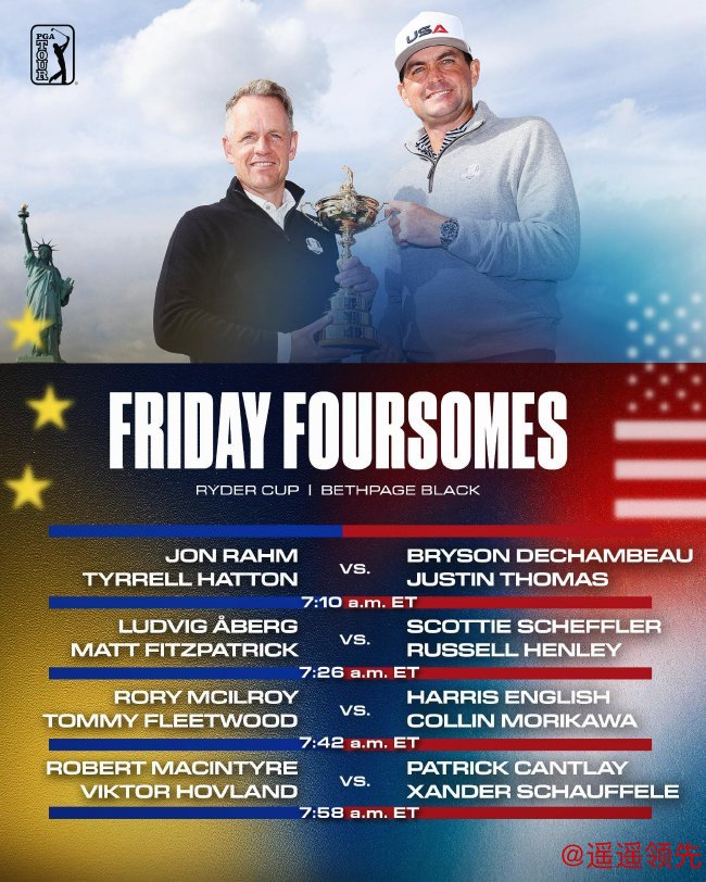 其他对阵包括:世界第一斯科蒂-舍夫勒与罗素-亨利迎战欧洲队的阿伯格和马特-菲茨帕特里克;麦克罗伊和弗利特伍德对阵科林-森川与哈里斯-英格利希;霍夫兰和罗伯特-麦金泰尔则迎战赞德-谢奥菲勒和帕特里克-坎特利。